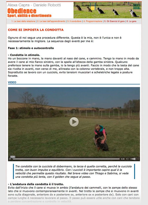 “Obedience - le tecniche di base” comprende 220 clip video. I video raccolgono diverse tecniche di lavoro, nei diversi esercizi. Ho volutamente inserito anche degli errori, per dimostrare come quel binomio affronta nella realtà l’esercizio. Ho volutamente filmato sessioni con cani e con conduttori inesperti, che mi costringono a ragionare sulle tecniche usate nell’impostazione di base. E ho fortemente voluto cani di razze diverse, perché credo che questa disciplina abbia molto da insegnare a tutti i proprietari.