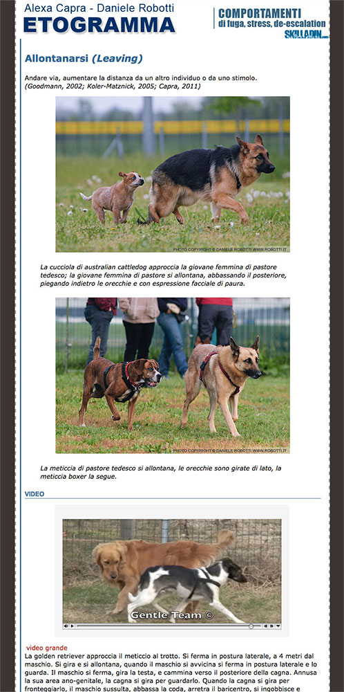 Nel 2008 ho iniziato a raccogliere tutte queste informazioni in un etogramma. Ho anche iniziato la ricerca di fotografie (di Daniele Robotti), e a filmare oltre ai test ore di interazioni durante le classi di comunicazione. Questo lungo lavoro di ricerca è raccolto in una serie di cd, il primo dei quali è dedicato ai comportamenti agonistici: tutti i comportamenti associati all'aggressività - minaccia, difesa, attacco.